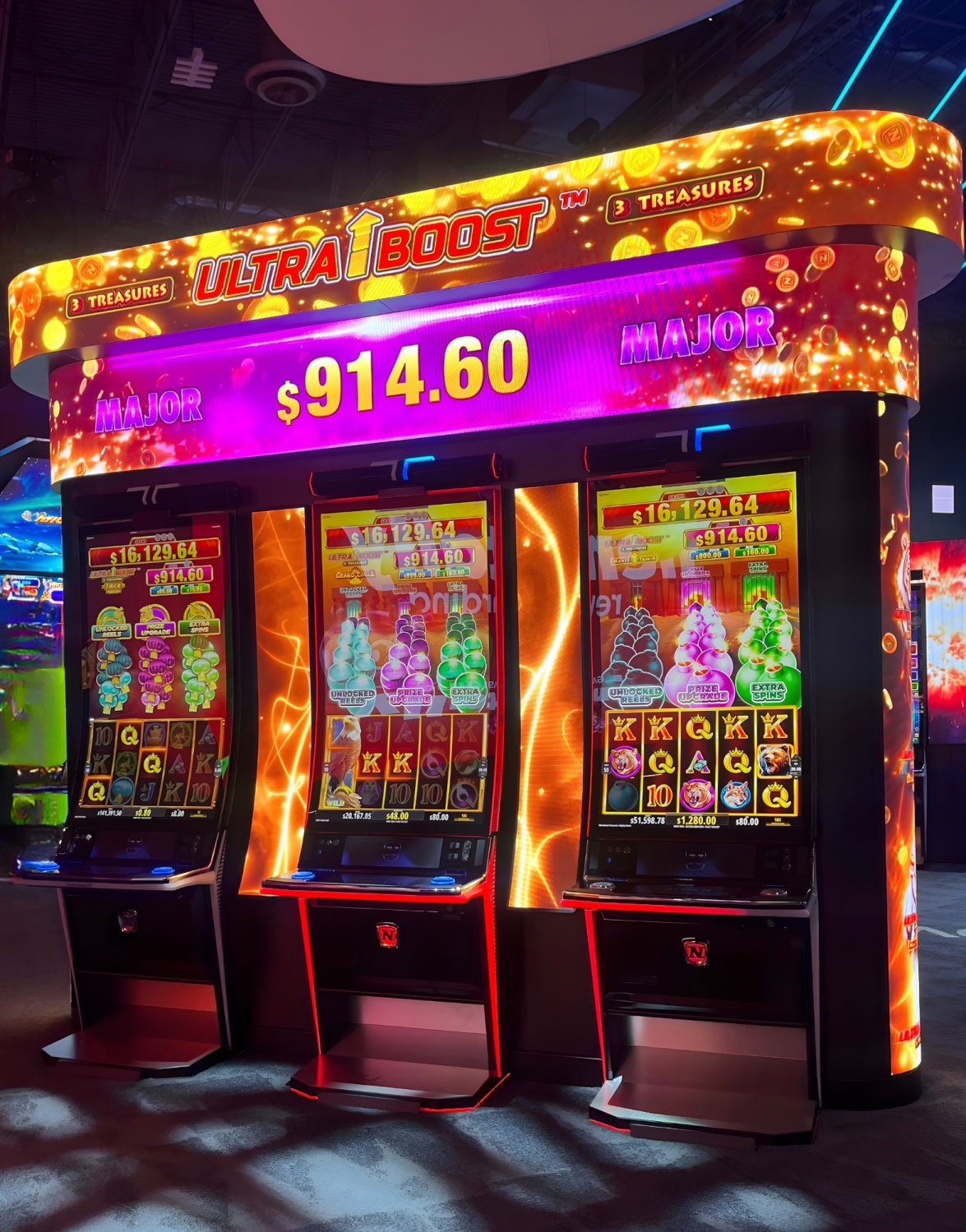 RISING TREASURES™ linked progressive series returns with renewed strength, featuring proven favorites including Book of Ra™ Treasure Gods, Sizzling Hot™ Treasure Inferno, Rise of Cleo™ Treasure Coins, Rise of Tut™ Treasure Coins, and more, all enhanced with a bold ‘visibility first” sign package engineered to drive attention and reinforce brand recognition across the casino floor. ULTRA BOOST™ 3 Treasures builds on its established momentum with Tiger Storm, Mighty Taurus, and Grand Eagle, presented in merchandising packages designed to anchor premium progressive zones and sustain high performance.