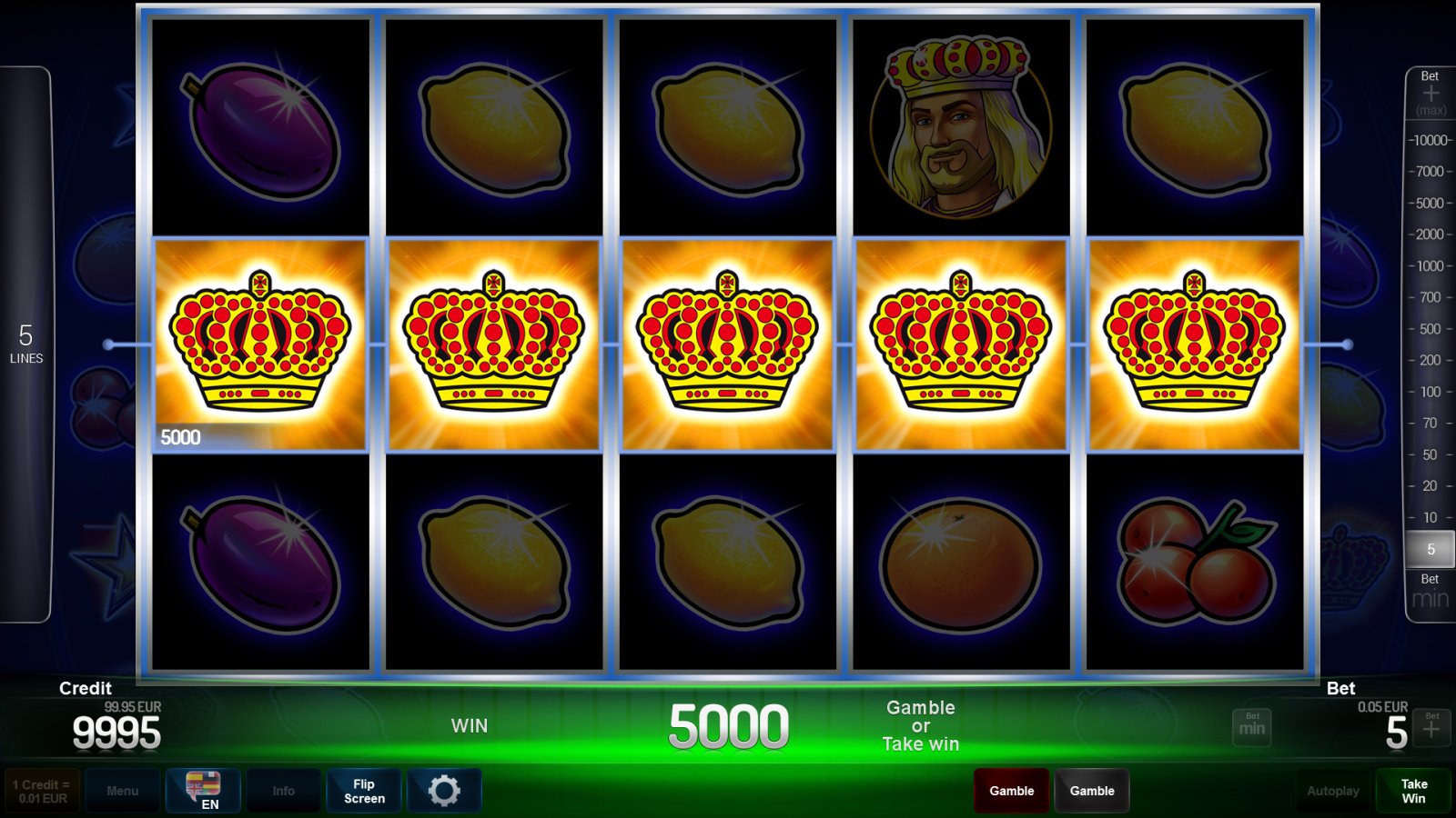 This fruit game promises opulent gaming entertainment. The top symbols Crown, King, Queen and scattered Star make Fruits ’n Royals™ a very special gaming treat for great gaming fun and royal prizes.