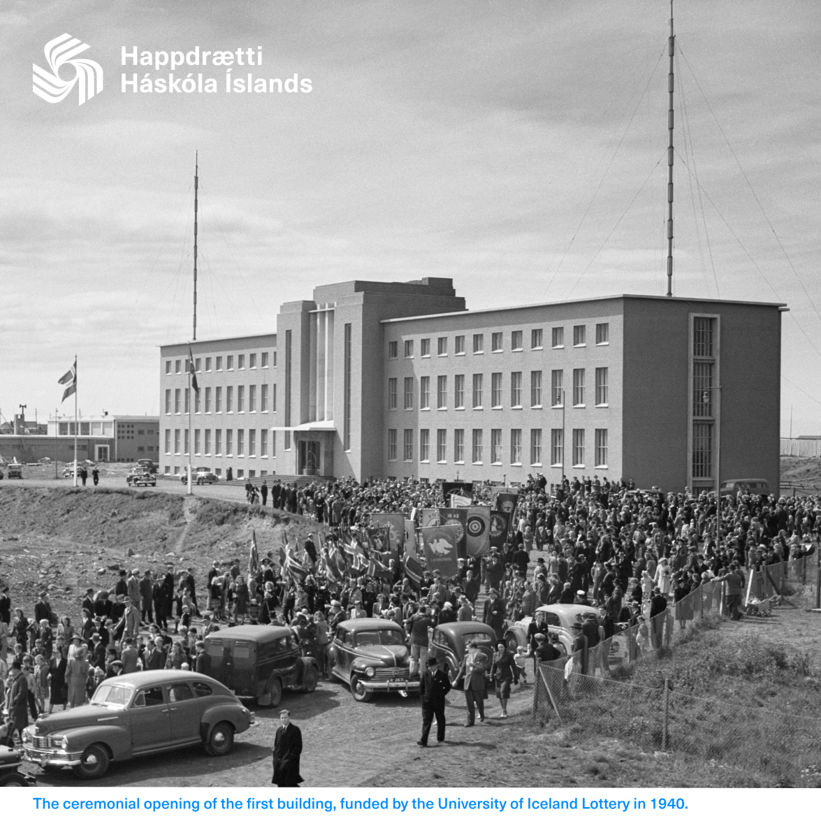 Historisches Bild: Die feierliche Eröffnung des ersten Gebäudes, finanziert durch die Lotterie der Universität Island im Jahr 1940. (©UIL)